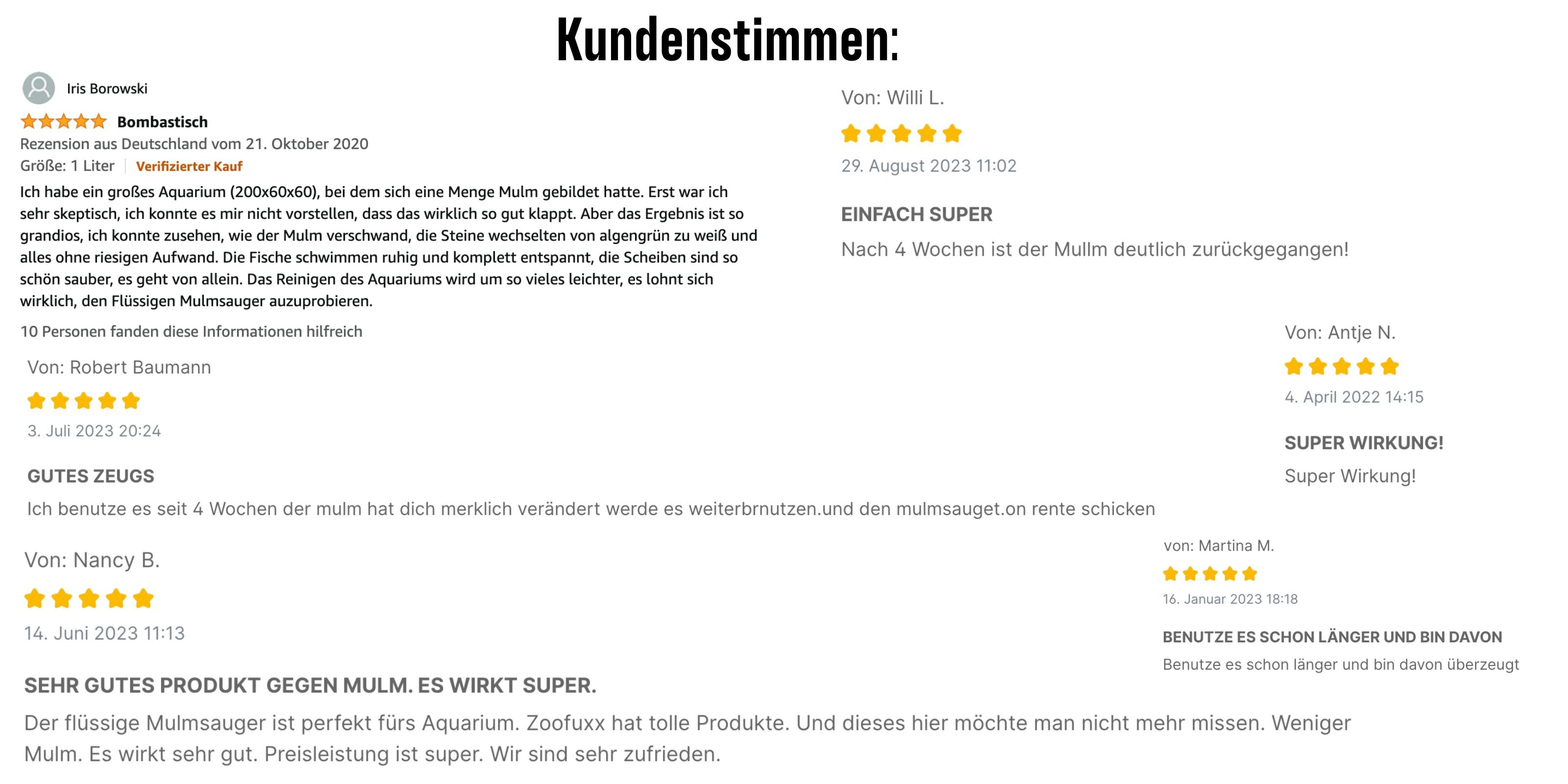 Mit AQUASAN Mulmvec Flüssiger Mulmsauger Plus setzen Sie auf ein Produkt, das von Fachleuten und Aquarianern gleichermaßen geschätzt wird. Die Anerkennung als "Aquaristik Produkt des Jahres" zeugt von unserem führenden Stand in der Aquaristikbranche, während das Siegel "Sehr Gut" von Warentest Online unsere Verpflichtung zur Qualität und Kundenzufriedenheit bestätigt.